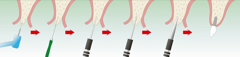 柔らかい顎骨にドリルで穴を開けてインプラントを埋入するのではなく、細い針状の物から挿入し、徐々に太い物へと繰り返し、骨を圧縮強化しながらインプラントを埋入するスペースを作り上げます